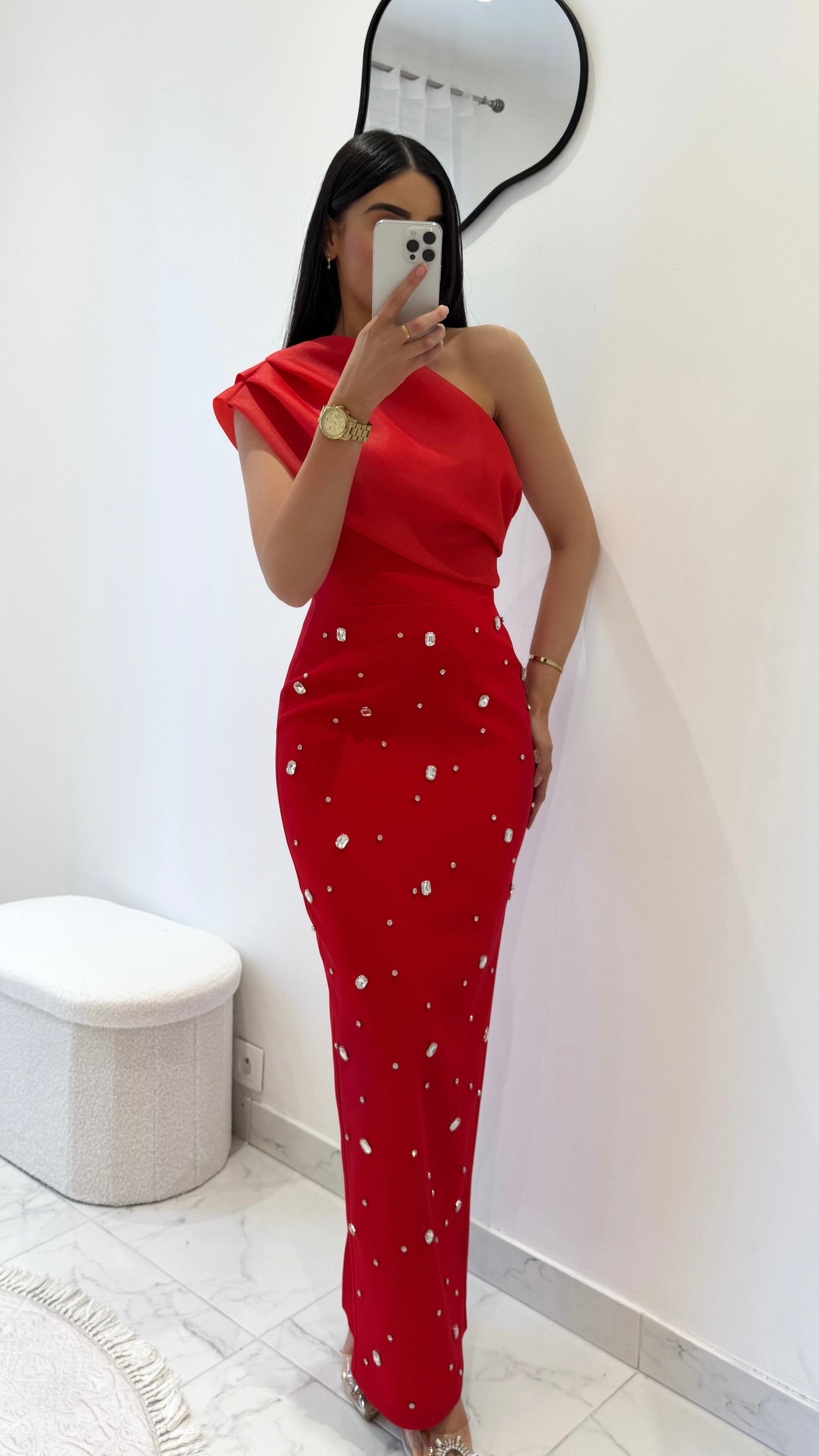 Modele Aslı simplicité, une robe rouge ornée de diamant argenté . Le modèle porte une taille 36.