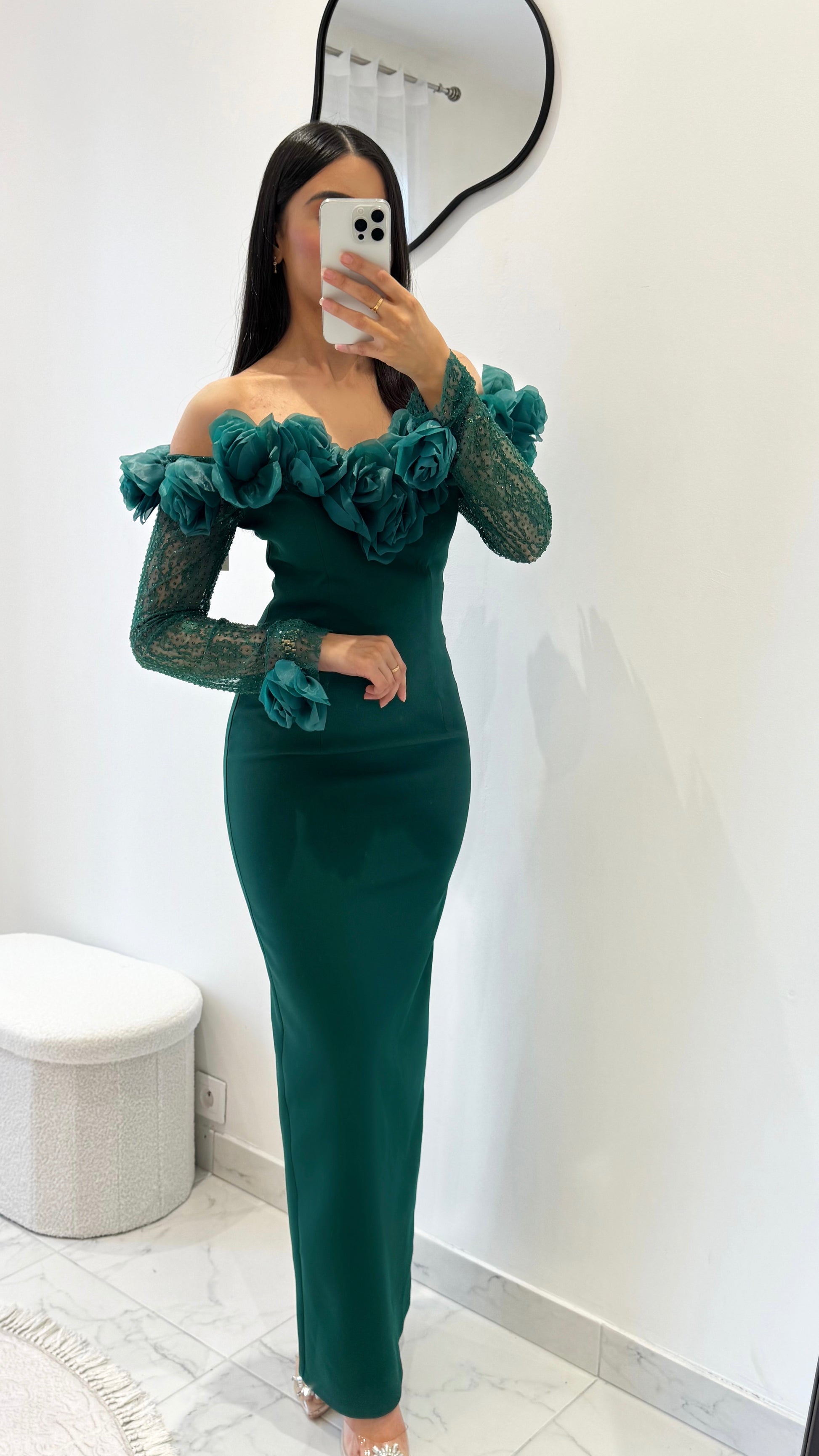 Cette robe mi longue vert émeraude sublime la silhouette avec élégance. Le bustier est orné de fleurs en relief pour un effet spectaculaire, tandis que les manches en dentelle apportent une touche de délicatesse. Le modèle porte une taille 36.