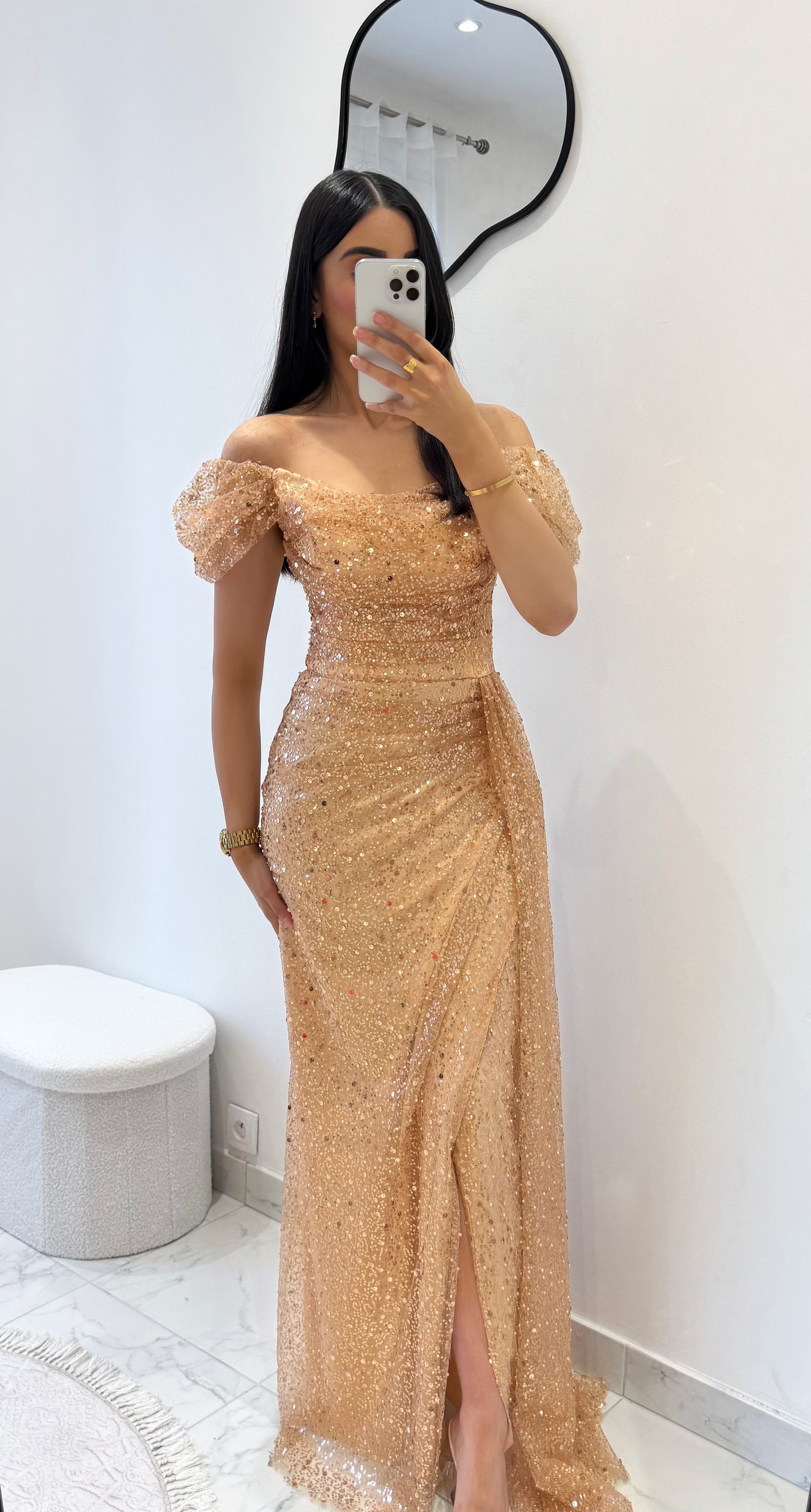 Éclat et élégance se rencontrent dans cette somptueuse robe longue champagne doré entièrement brodée de sequins. Ses manches bouffantes tombantes et sa fente subtile mettent en valeur la silhouette avec raffinement.